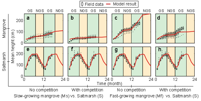 图2 不同红树林物种(秋茄和无瓣海桑)与互花米草盐沼在有无竞争条件下的初始生长情况与现场实验数据的对比。